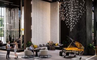 На первом этаже центральной секции находится просторное, с 7-метровымипотолками, лобби. В его основу легла концепция пятизвездочных отелей. Место для общих посиделок соседей, праздничных мероприятий и концертов настоящего рояля.
