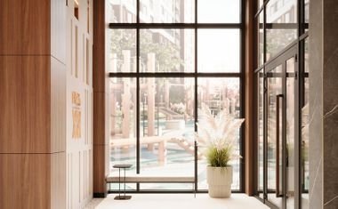 Холлы проекта сквозные, оформлены в едином стиле: светлые пространства с отделкой под дерево и камень, мягкие пуфы.