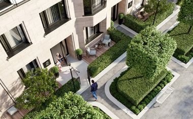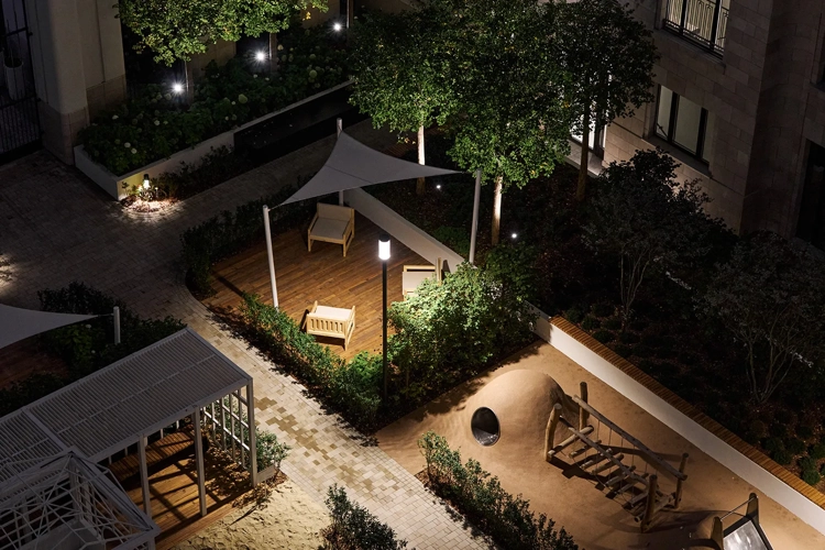 Жилой комплекс представляет собой полузамкнутый квартал высотой 9-17 этажей с подземным паркингом. Во внутреннем дворе, образованном массивом здания, нет уличного шума и ветра. Переменная этажность дома делает двор и квартиры светлыми.